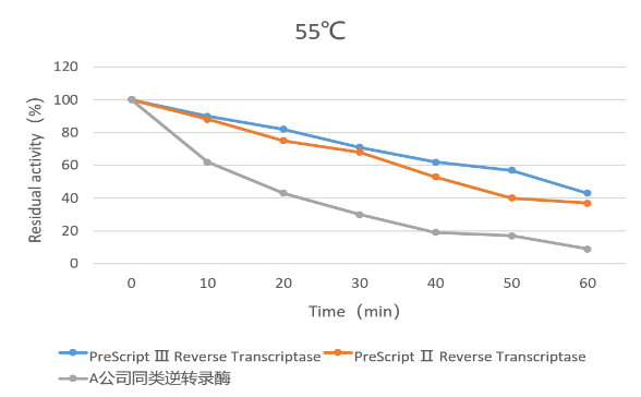 將PreScript Ⅲ Reverse Transcriptase、PreScript Ⅱ Reverse Transcriptase和A公司同類逆轉(zhuǎn)錄酶在55℃下孵育,在不同時(shí)間分別取樣檢測(cè)其活性,結(jié)果顯示,PreScript Ⅲ Reverse Transcriptase和PreScript Ⅱ Reverse Transcriptase具有比A公司同類逆轉(zhuǎn)錄酶更高的熱穩(wěn)定性。