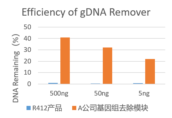 分別投入500ng、50ng、5ng HeLa細胞gDNA 使用英贊R412產(chǎn)品和A公司同類產(chǎn)品中基因組去除模塊做清除效率檢測,結(jié)果顯示,R412產(chǎn)品中的4 × gDNA wiper 可清除高達500 ng 的基因組殘留,并且清除效率達到99% 以上。