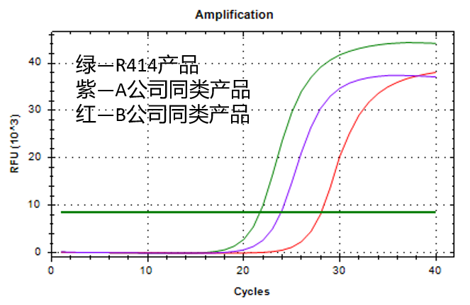 以1μg HeLa細(xì)胞RNA為模板,使用R414產(chǎn)品和市售其他公司同類產(chǎn)品,按照各自說(shuō)明書推薦體系和程序進(jìn)行逆轉(zhuǎn)錄反應(yīng)。以逆轉(zhuǎn)錄得到cDNA為模板,挑選高表達(dá)量和較低表達(dá)量?jī)煞N基因,進(jìn)行Realtime PCR檢測(cè)這兩種基因,結(jié)果顯示(左圖為高表達(dá)量基因檢測(cè)結(jié)果,右圖為較低表達(dá)量基因檢測(cè)結(jié)果),R414產(chǎn)品的逆轉(zhuǎn)錄效率優(yōu)于其他公司同類產(chǎn)品。
