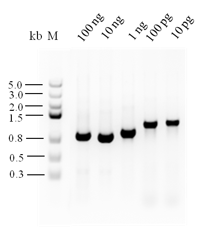 將人293T細(xì)胞來源的100ng Total RNA進(jìn)行10倍梯度稀釋,共5個(gè)梯度(100ng~10pg),擴(kuò)增基因?yàn)?/span>GAPDH,片段長(zhǎng)度為0.8kb的基因片段,實(shí)驗(yàn)結(jié)果表明,PreScript One-Step RT-PCR Kit檢測(cè)限低至10pg。