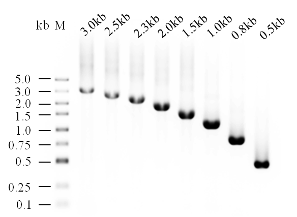 以Hela細(xì)胞來源的20ng Total RNA為模板,擴(kuò)增片段長(zhǎng)度為0.5kb~3.0kb的基因片段,結(jié)果表明,本產(chǎn)品可輕松擴(kuò)至3kb,且無明顯非特異產(chǎn)生。
