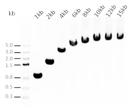 以Hela細胞來源的100ng Total RNA為模板,擴增片段長度1.0kb~15kb的基因片段,結(jié)果表明,本產(chǎn)品可輕松擴至15kb,且無明顯非特異產(chǎn)生。