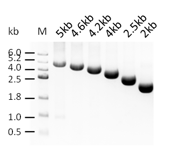 帶有T7啟動子的不同目標(biāo)長度的DNA轉(zhuǎn)錄成RNA。目標(biāo)片段長度標(biāo)于電泳圖上方