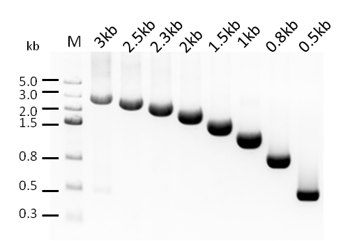 以人基因組為模板進(jìn)行超快速PCR擴(kuò)增,擴(kuò)增1kb以下的目標(biāo)片段時(shí)延伸時(shí)間設(shè)為1s/kb,1kb以上的目標(biāo)片段時(shí)按15s/kb設(shè)定可以得到清晰的條帶